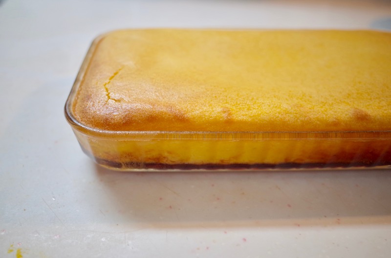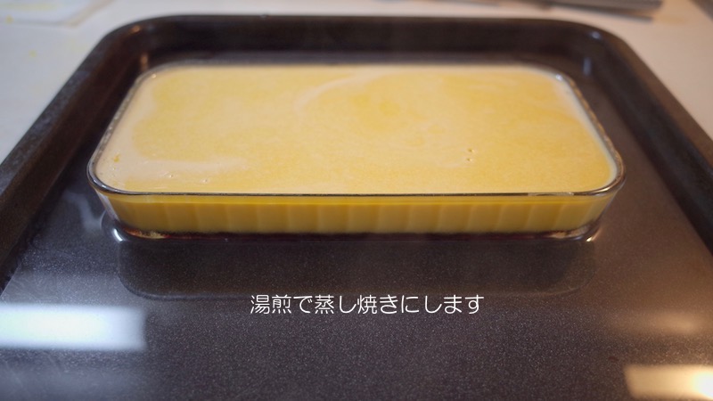 気にならなければ、そのまま型に流します。*こちらは、濾した状態です。 - 1のカラメルソースを流した型に5を流し込んで、160度に余熱をしたオーブンで40~45分焼成する。*オーブンに入れるときは、天板に湯を1~2センチはって、その中に型を置いて湯煎状態で焼き上げます。