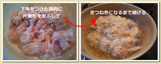 - 下味をつけた鶏肉は片栗粉をまぶし、きつね色になるまで揚げる。