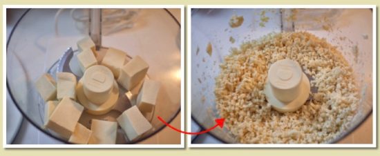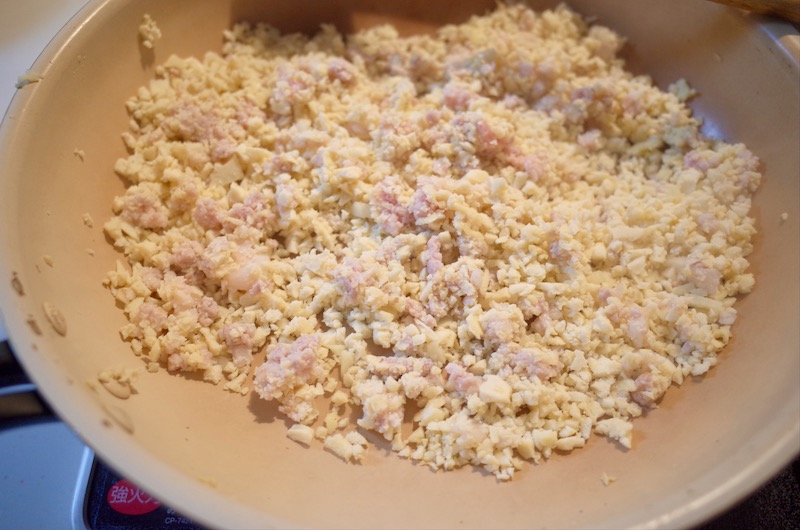 - 戻して水分をカットした高野豆腐は、フードプロセッサー(もしくは包丁で)みじん切りにする。