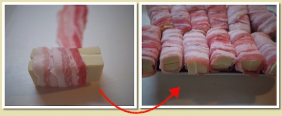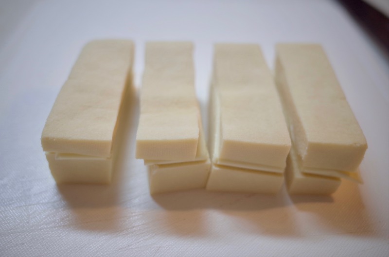 - 戻して水分をカットした高野豆腐は厚さを半分にカットする。スライスチーズを挟んで、⒋等分にカットする。