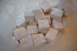 - 戻して水気をい切った高野豆腐は、12等分くらいにカットする。
