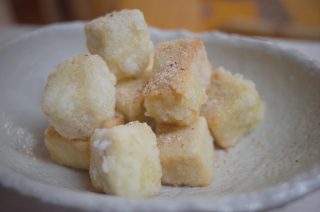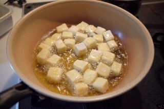 - 戻して水気を切った高野豆腐は、<高野豆腐の唐揚げ>を参考にして片栗粉をまぶして揚げる。