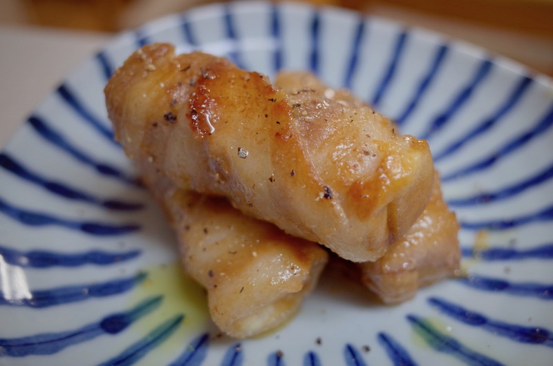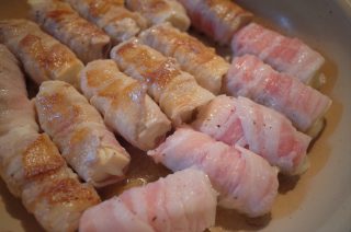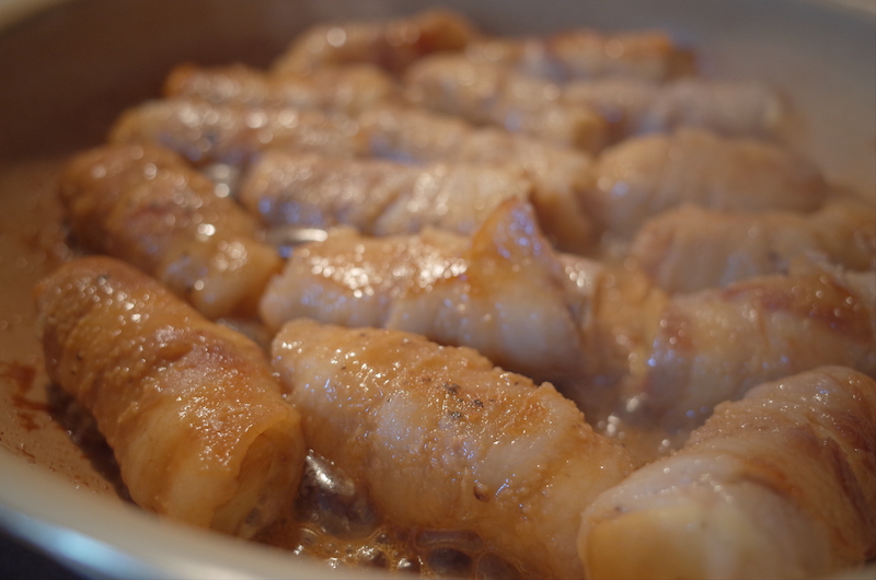 - フライパンにサラダ油を熱し、②の肉の巻き終わりを下にして焼く。