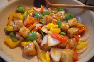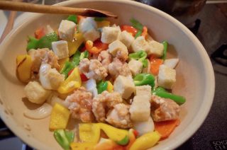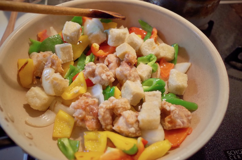 - 野菜に火が通ったら、唐揚げにした高野豆腐と鶏肉を加えてなじませる。