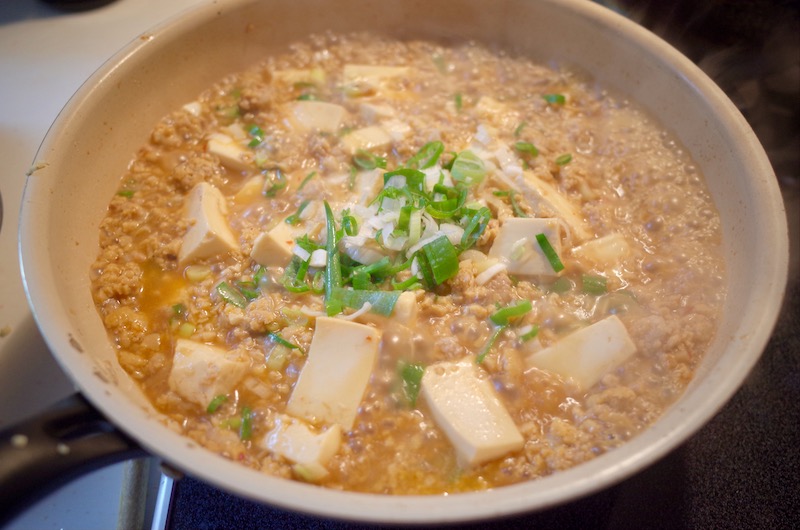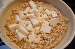 - 合わせた調味料を加えて一煮立ちしたら、豆腐をさいの目にカットして加える。