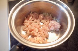 - フライパン(小鍋)に鶏ひき肉と生姜を入れて中火にかけ、ひき肉が白っぽく丸までほぐしながら火を通す。
