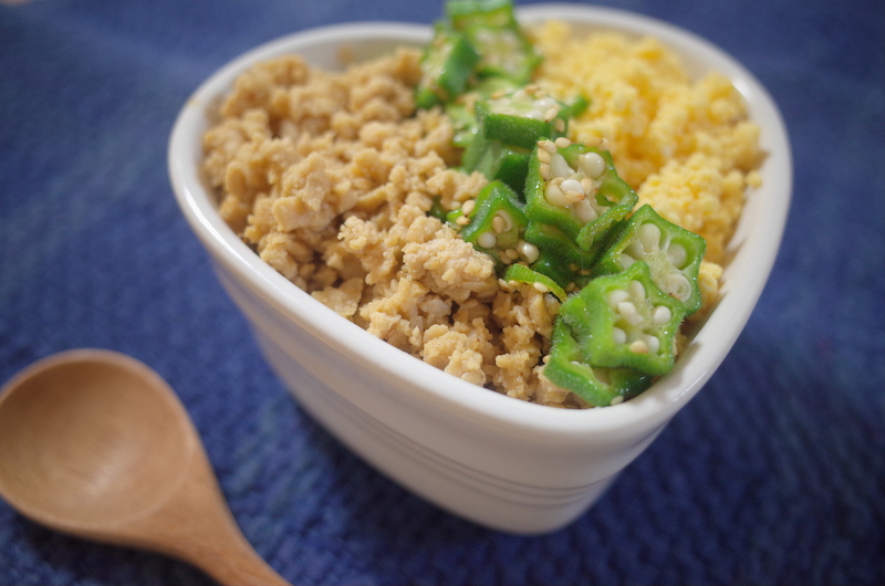 器にご飯を持って、そぼろ、炒り卵、オクラを乗せて出来上がり!