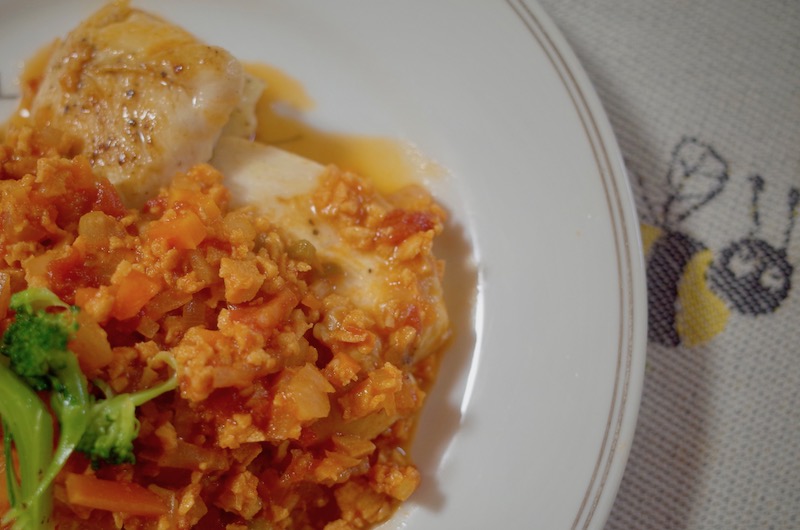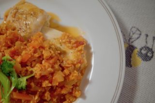 - トマトの缶詰を加え、トマトが大きいようだったらヘラで潰しながら全体をなじませる。コンソメキューブ、ケチャップ、ウスターソースを加えて一旦沸騰したら火を弱めて、蓋をして10分ほど煮る。