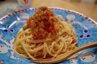 ニンニク、玉ねぎ、人参、セロリ、ピーマンもみじん切りにする。 - フライパン(鍋でもOK)にオリーブオイルとニンニクを入れて火にかけて、香りが出るまで炒める。