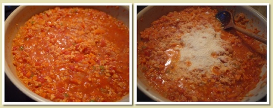 - 野菜が柔らかくなって水分が少なくなってきたら、パルメザンチーズを加えて一混ぜして火を止める。
