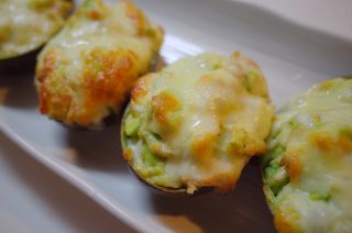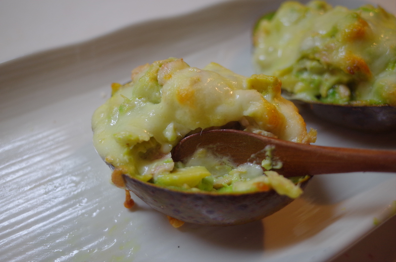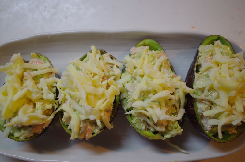 - ②を①のアボカドの皮に詰めたら、シュレットチーズを乗せる。
