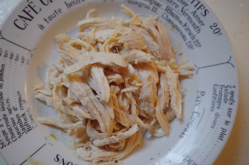 - 耐熱容器にムネ肉を入れて酒をふりかけたら、ふわっとラップをして電子レンジ(600ワット)で5分程加熱して、粗熱が取れたら、手で細かく裂いておく。