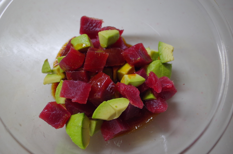 *マグロは赤身を使っています。 - アボガドとマグロをボウルに入れて、調味料(醤油、ごま油、コチュジャン、酢、塩)を加えて全体を混ぜて味をなじませる。