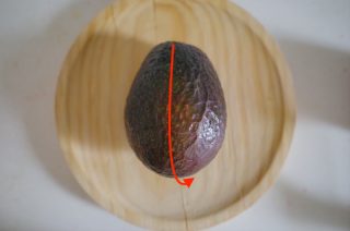 - アボカドは皮を剥く前にまずヘタからお尻に向けて縦に半分にナイフを入れ、真ん中の種に沿ってくるっと一周させます。