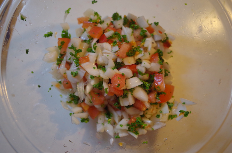 トマト、たまねぎ、パセリ、とうがらしをそれぞれみじん切りにしてボウルに入れ、塩・こしょう、レモン汁を加えて全体にませて味をなじませる。