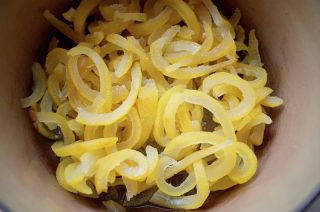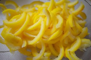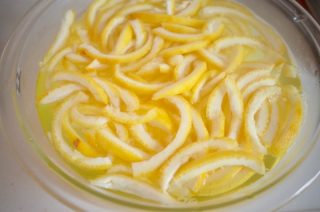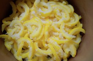 *最初は粗削りだった皮が、しっとりとした薄いオレンジ色になります。 - 水気を切った皮を鍋に入れて、砂糖の1/3量をまぶしてしばらくおく。
