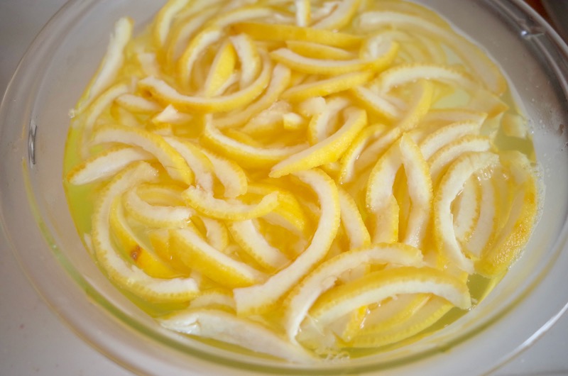 - カットした皮をボウルに入れて、ここに熱湯を注いで10~15分くらい放置する。