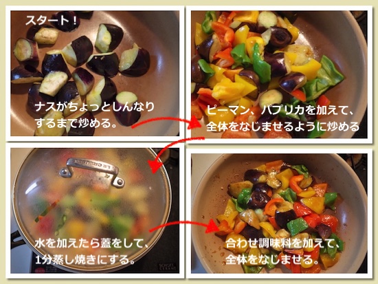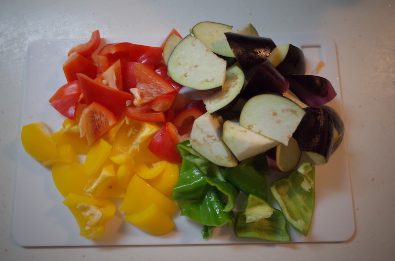 - ナス、ピーマン、パプリカはそれぞれ一口大にカットする。