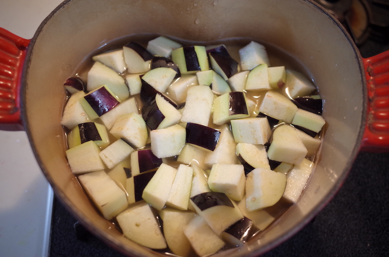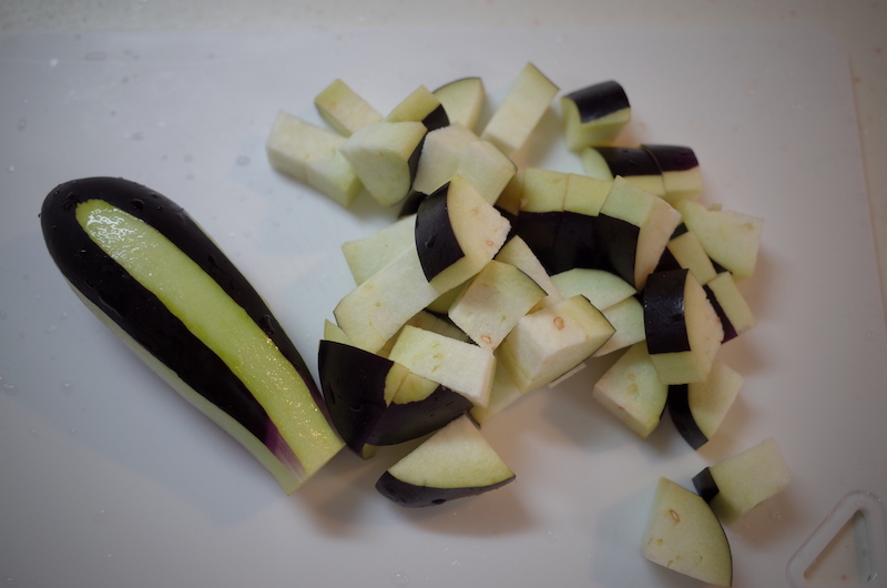 *ナスから水分が出るので、水の量は少なめです。 - ナスは、1センチ角くらいの角切りにして、5分ほど水にさらして水気を切っておく。