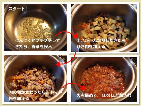 - ナスは1センチくらいのさいの目に、玉ねぎ、人参とにんにくはみじん切りにする。