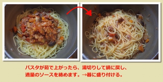 茹で上がって湯切りしたパスタは茹でた鍋に戻し、適量のソースを絡める。