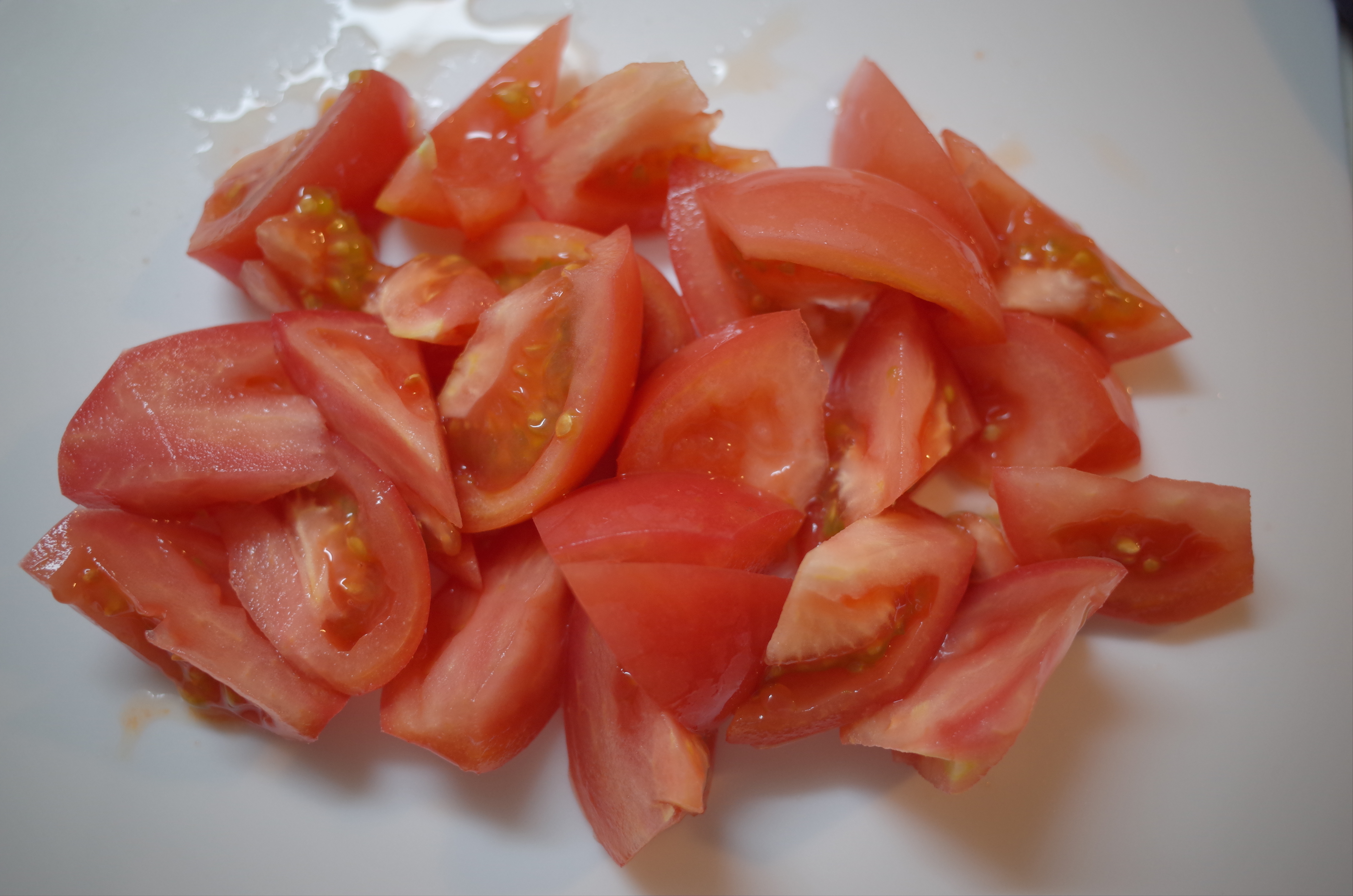 - トマトはざく切りにする。ナスは2センチくらいの半月切りにして水にさらす。