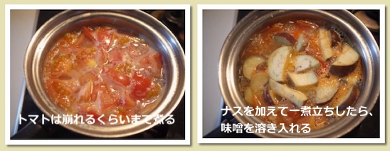 - ナスを加えて一煮立ちしたら、火を弱めて味噌を溶き入れる。