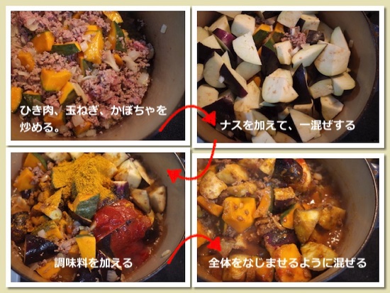 - 肉の色が少し変わってきたら玉ねぎとかぼちゃを加え、玉ねぎが透明になってきたらナスを加える。