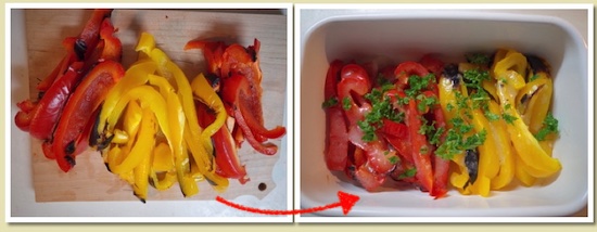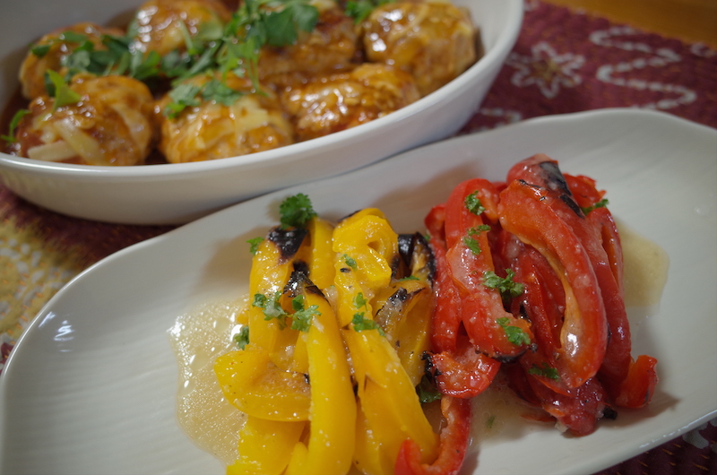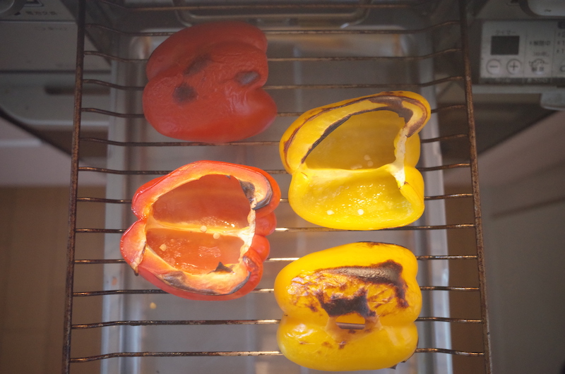 1. パプリカは半分にカットして種を取り、魚焼きグリルの網に乗せて8〜10分ほど焼く。