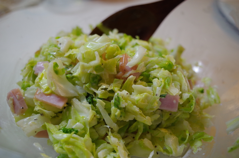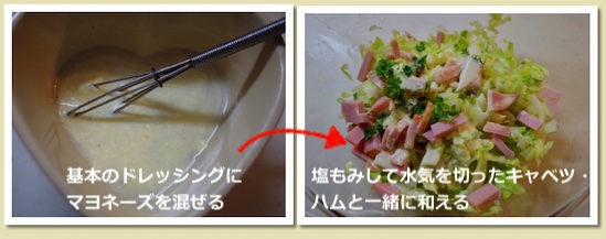 2. ①にハム、作っておいたコールスロー風オニオンドレッシングとブラックペッパーを加えて混ぜる。