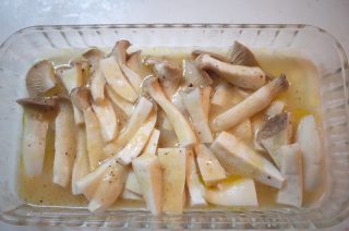 1. エリンギは食べやすい大きさにカットして耐熱皿に並べる。適量の塩・胡椒を振って、軽くラップをして電子レンジで3分くらい加熱する。