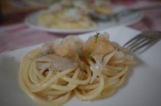 ↓フォークで一口分をくるくると巻いてお皿において、その上にトッピングしました。