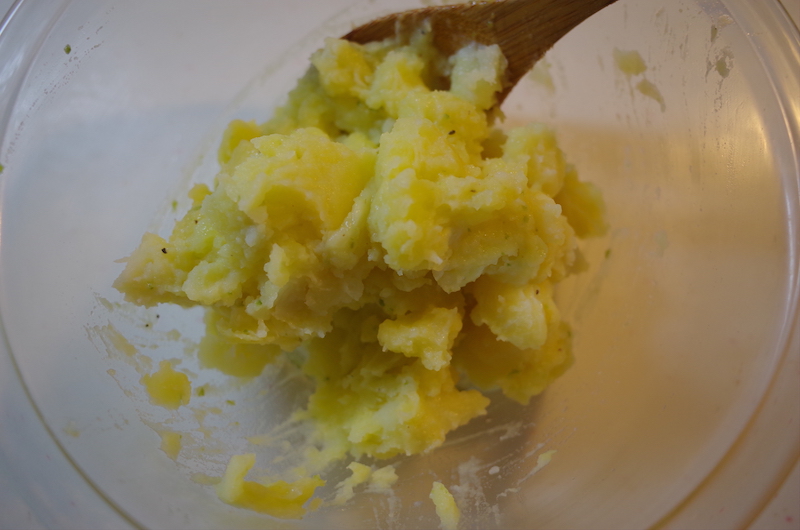 3. 蒸し終わったじゃがいもは皮をむいてボウルに入れ、基本のドレッシングを加えて荒く潰す。
