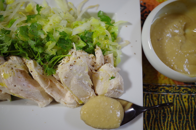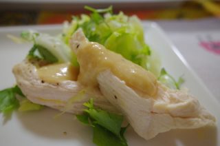 蒸し鶏、茹で野菜、イタリアンパセリをお皿に並べて、ドレッシングを添えてサーブします。