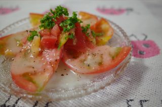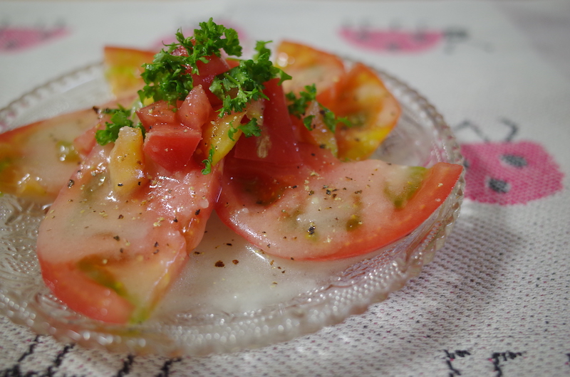 *カットしたトマトにドレッシングをかけて、みじん切りのパセリをトッピングしました。