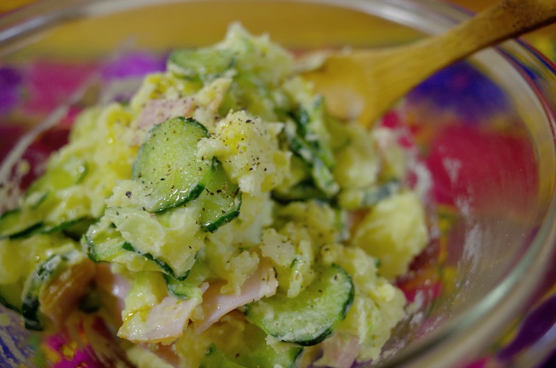 4. ③の粗熱が取れたら、ハムと水分を切ったきゅうり、マヨネーズを加えて全体をざっくりと混ぜる。
