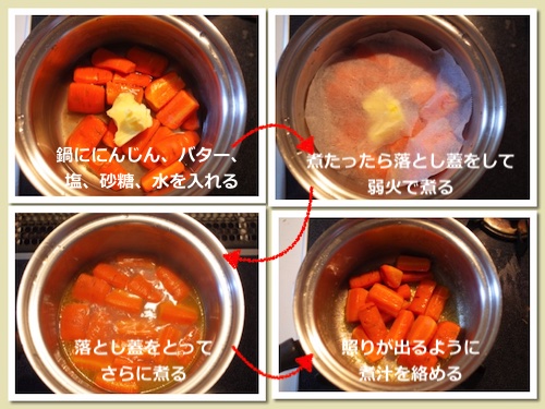 2. 鍋ににんじん、バター、砂糖、塩、水をいれて強火にかける。