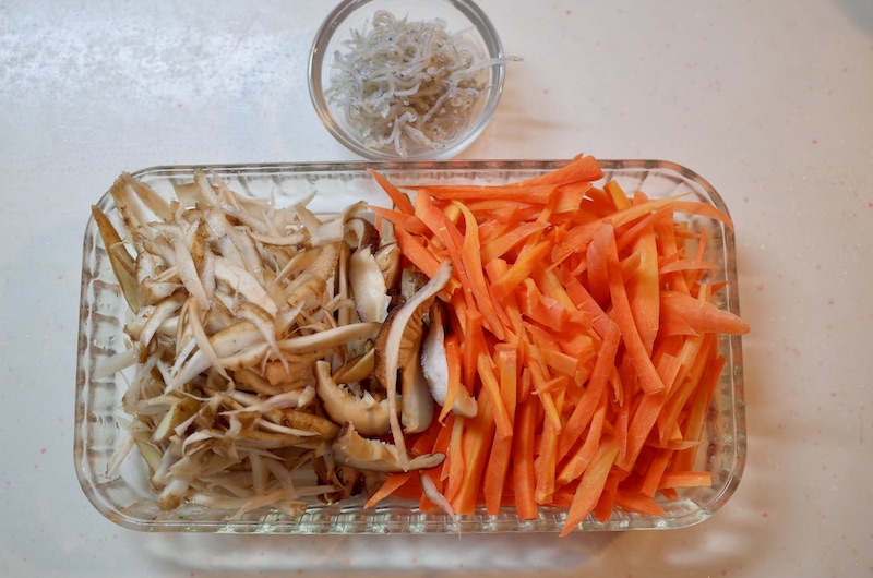 3. にんじん、油揚げ、干し椎茸は千切りにする。