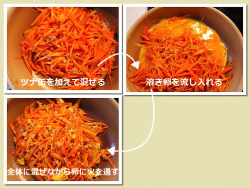 3. フライパンにサラダ油を熱して、にんじんを加えて強火で炒める。しんなりしてきたら、油を切ったシーチキンを加えて炒め合わせる。
