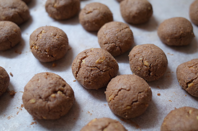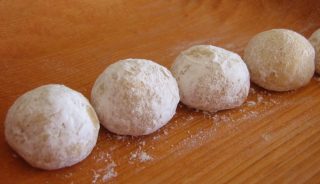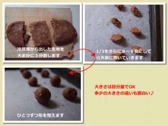 - 生地と取り出して大まかに3つに分ける。一つを8〜10個くらいに手でちぎりながら天板に乗せ、その後丸い形に整える。