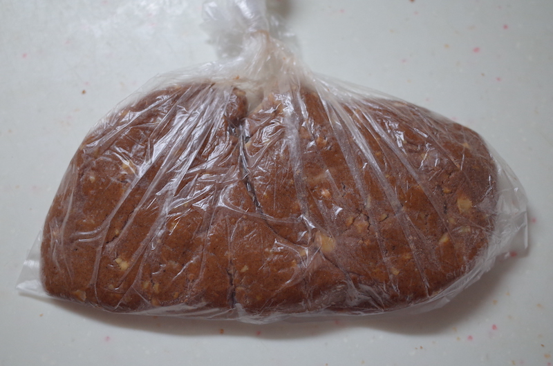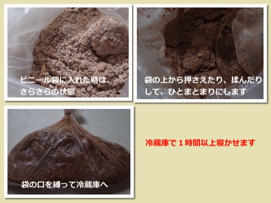 - 生地をまとめてビニーブル袋に入れて口を縛って冷蔵庫で1時間ほど休ませる。
