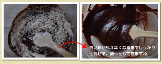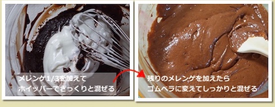 - ②のボウルに③のメレンゲ1/3を加えて泡立て器で軽く混ぜて馴染ませる。さらに残りのメレンゲを加え、ゴムベラでさっくりと混ぜ合わせる。