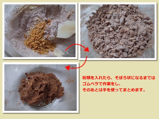 かけすぎると液体になってしまうので注意してくださませ(^◇^;) - ふるった薄力粉、アーモンドパウダー、細かく刻んだくるみを加えて、ゴムベラで粉っぽさがなくなるまで混ぜ合わせる。