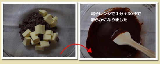 - 耐熱用のボウルにチョコレートとバターを入れ、電子レンジで1分かける→一旦取り出してゴムベラで全体を混ぜる→30秒かける。