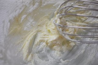 - 室温に戻して柔らかくしたバターをボウルに入れ、クリーム状になるまで泡立て器でねってから、砂糖と塩を加えて白っぽくなるまですり混ぜる。