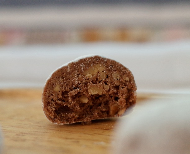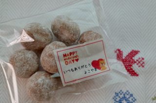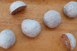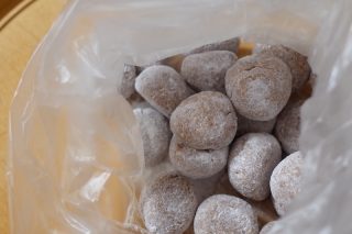 - 焼き上がったら取り出す。→完全に覚めたらポリ袋に入れた粉糖の中でシャカシャカとまぶす。