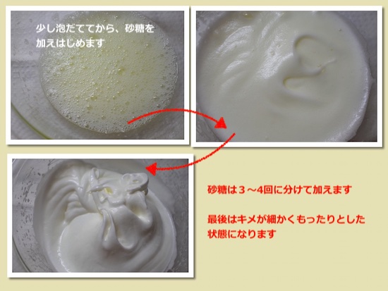 - 別のボウルに卵白を入れて、砂糖を少しずつ加えながら泡立て、しっかりとしたメレンゲを作る。