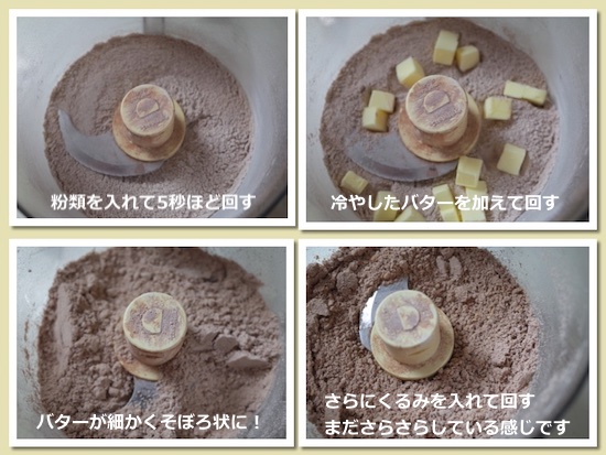 - 冷やしておいたバターを加えてスイッチのオンとオフを繰り返して、バターと粉を混ぜ合わせる(サラサラした状態)。