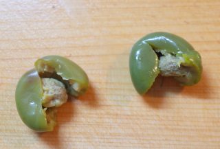 果実の色の違いは、熟成度や製造の仕方に違いがあるそうです。熟すにつれて、濃い緑色→淡い緑色→赤紫色→紫黒色に変化。グリーンオリーブは未熟な緑色の果実、ブラックオリーブは完熟した紫黒色の果実を塩漬けしたものです。