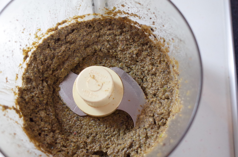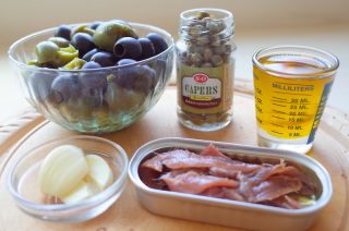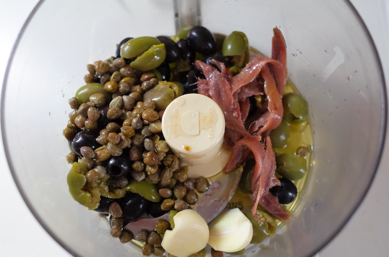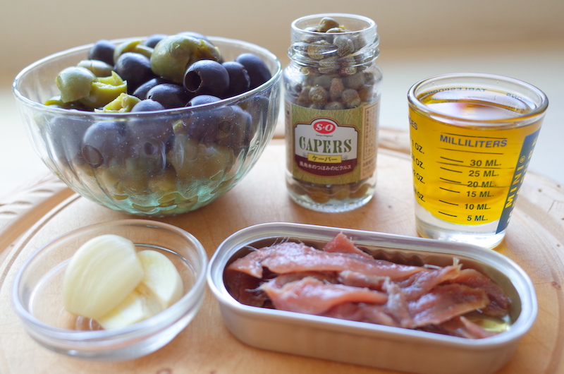 - オリーブ、ケッパー、アンチョビ、ニンニクを細かく刻んでボウルに入れる。